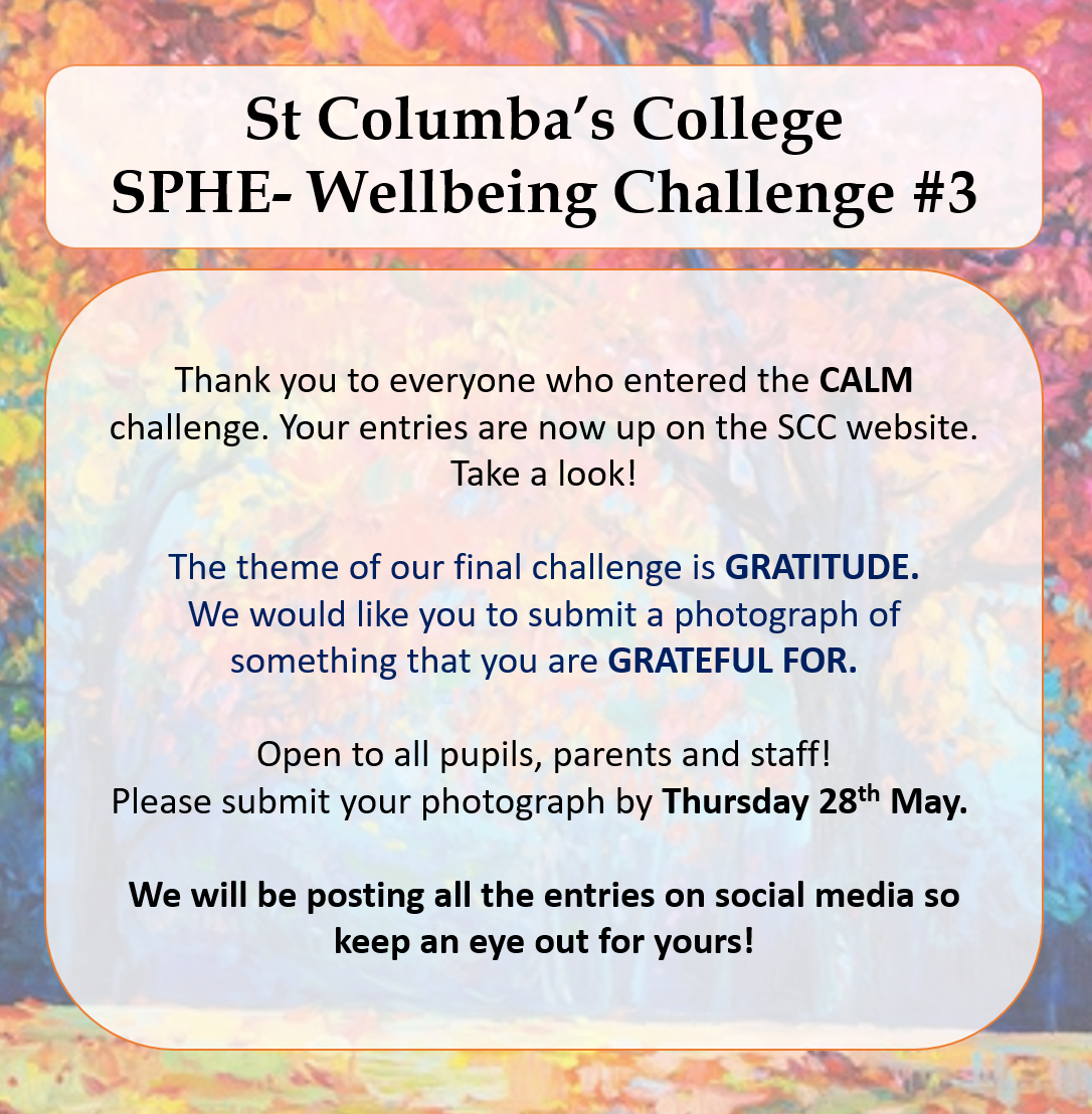 Today, Monday 20th April, we start term again (albeit not on the physical campus). The SPHE Department will be running a fortnightly photo challenge for pupils (and teachers and parents too!), to help them think about their wellbeing during the next six weeks. We’ll post entries on our Twitter and Facebook accounts, and they’ll be gathered in the album you can see below. Pupils have been contacted by Firefly about this already.