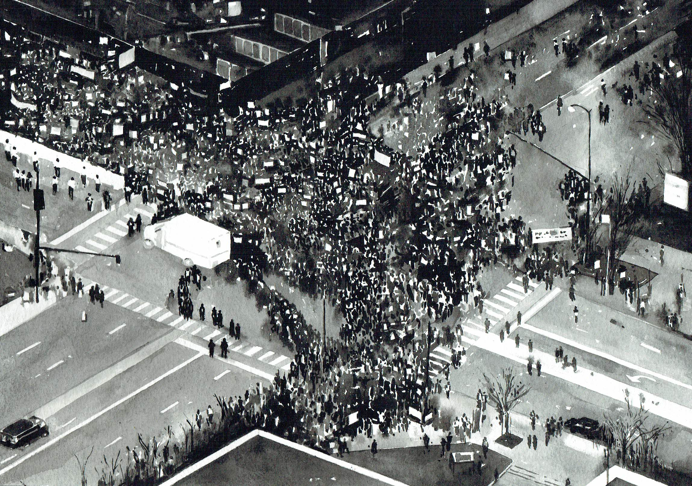 “Drawing on over a decade of image-making and research on themes of protest and urban space, Irish artist Joy Gerrard archives and painstakingly remakes media-borne crowd images from around the world. “ (From RHA exhibition, 2017)